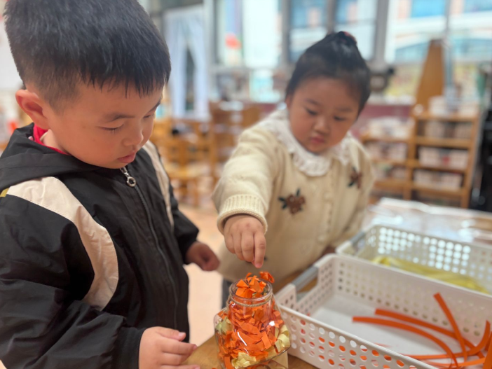 活动里宝贝们拿着长条彩纸,小手轻轻搓揉:先把平整的彩纸搓成细细的“小纸条”,指尖还会轻轻按一按让纸团更蓬松,把揉好的“秋叶”小心翼翼塞进透明许愿瓶:有的宝贝慢慢往瓶底堆,让“秋叶”一层层铺得满满当当;有的会把纸团轻轻抛进瓶里,看着它们在瓶中“躺”成软软的小堆,大家都是认真的模样~