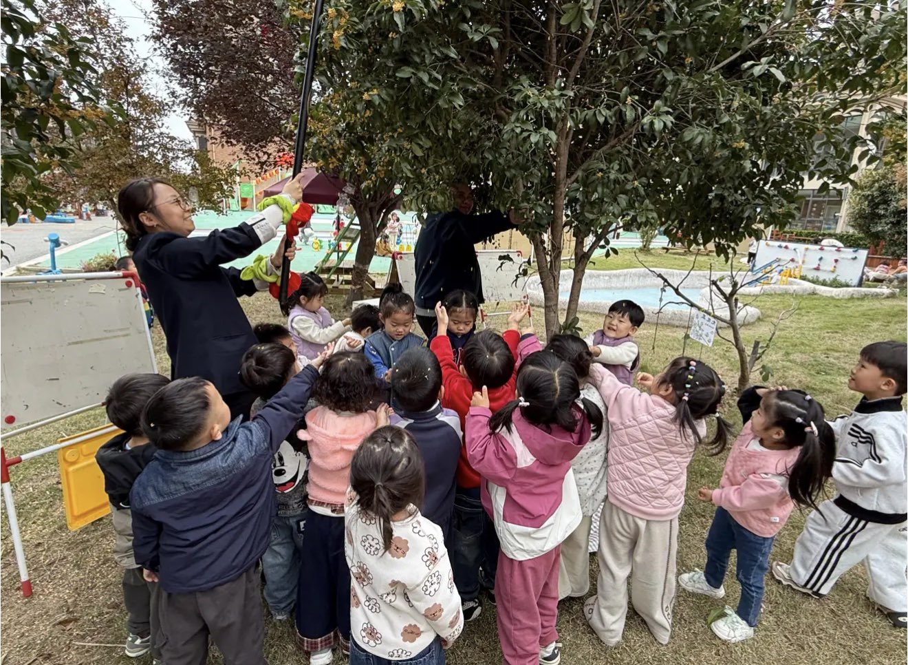 风再一吹,桂瓣又扑簌簌落下来。有孩子偷偷捏起一撮撒向同伴,金粉似的花屑便在小院里扬起轻软的雾,“咯咯”的笑声裹着桂香漫开,连空气都变得黏糊糊的甜。老师举着长杆轻敲枝桠,更多“星星”落下来时,孩子们高高举起透明杯子,要把这“秋天的味道”都装进去——杯底攒起的金黄,是他们亲手接住的秋日私语。