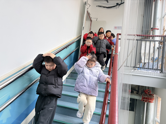 随着紧急的警报声响起,消防安全演练正式拉开帷幕。在教师的有序引导下,孩子们迅速用湿毛巾捂住口鼻,弯腰低姿,沿着预定安全通道快速、有序地撤离至操场安全区域。整个过程紧张有序、动作规范,无一人掉队、无一人喧哗,充分展现了良好的安全素养。