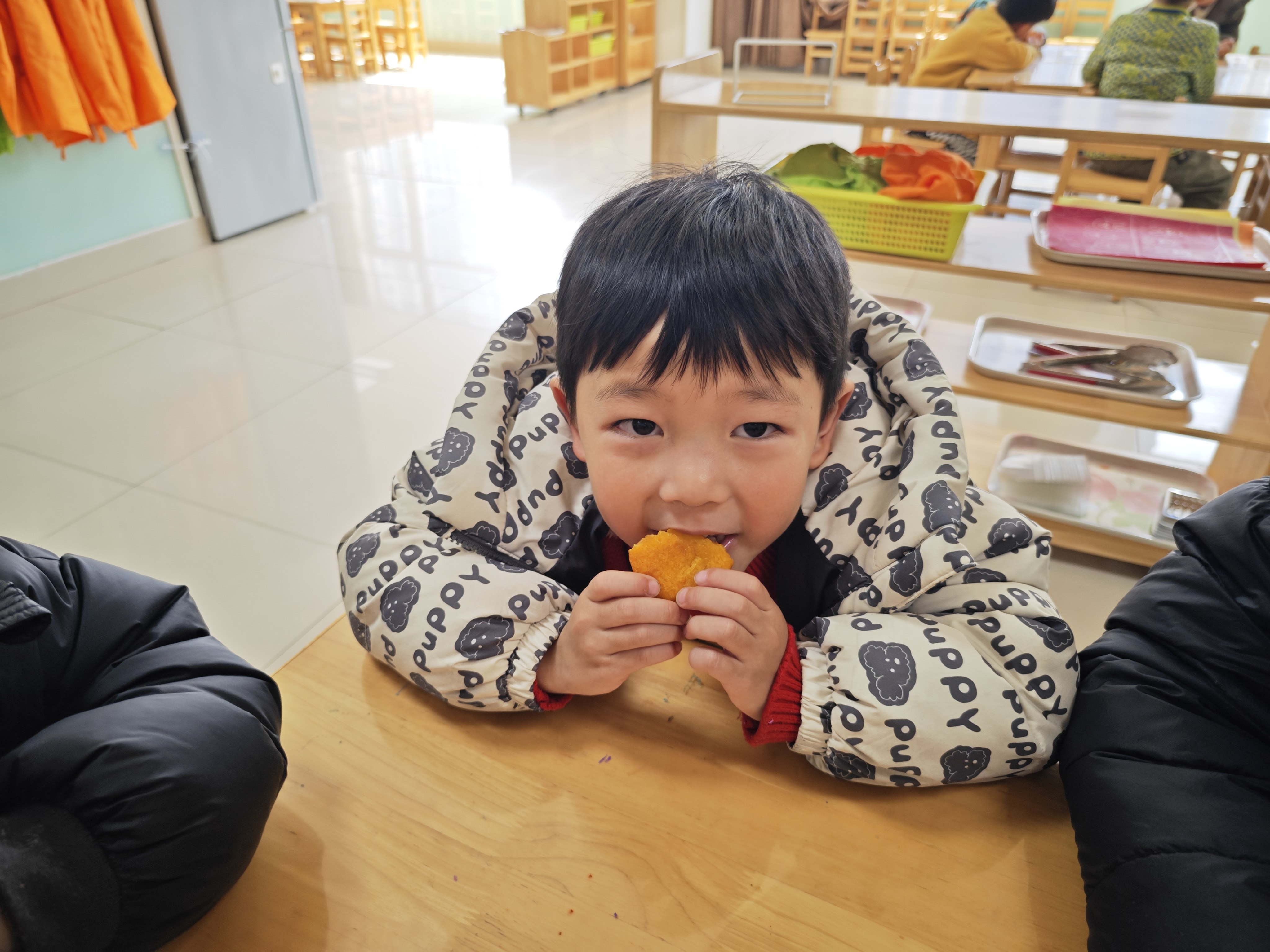 在教师协助煎制时,孩子们围在一旁耐心等待,闻着渐渐飘出的香甜气味,充满期待。南瓜饼出锅后,大家一同品尝自己亲手制作的美食,分享劳动带来的快乐。整个活动氛围轻松愉快,不仅锻炼了幼儿的动手能力与合作意识,也让孩子们在实践中体验劳动的乐趣,感受自己动手、收获美味的成就感。