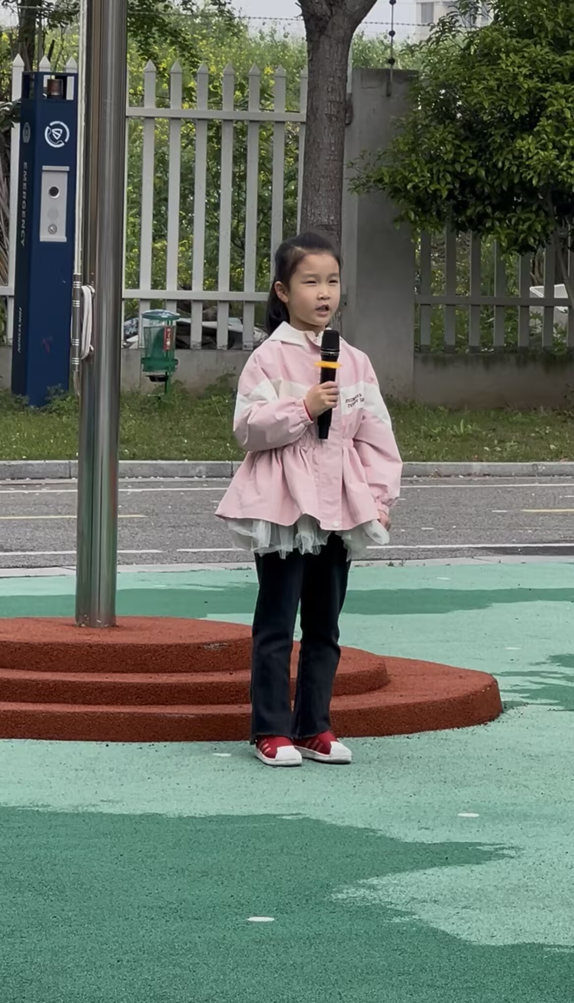她穿着粉白相间的外套,裙摆的白纱轻轻晃动,像一只准备振翅的小蝴蝶。一开始,我还悄悄捏了把汗——毕竟在全园老师和小朋友面前发言,对大班孩子来说是不小的挑战。可当她站定,深吸一口气,声音清亮地响起时,我瞬间被她眼里的光打动了。她认真地说着运动会上的趣事:“我还记得接力赛时,我们班的小伙伴拼尽全力往前跑,大家喊加油的声音比操场上的风还响!”说到和同伴们互相鼓劲的场景,她的嘴角忍不住上扬,眼睛里亮晶晶的,满是骄傲与欢喜。