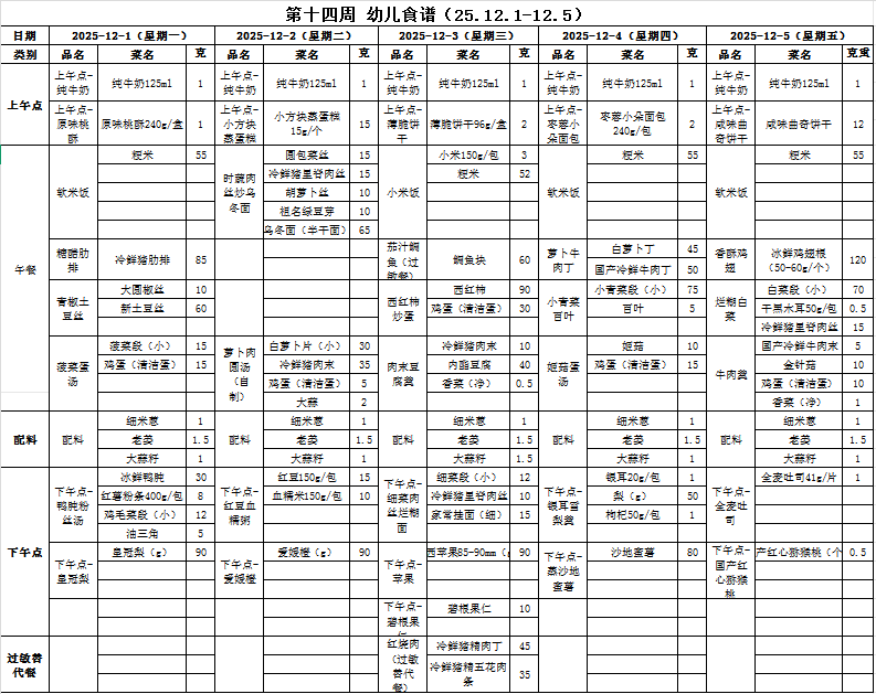 第十四周 幼儿食谱(2025.12.1-2025.12.5)