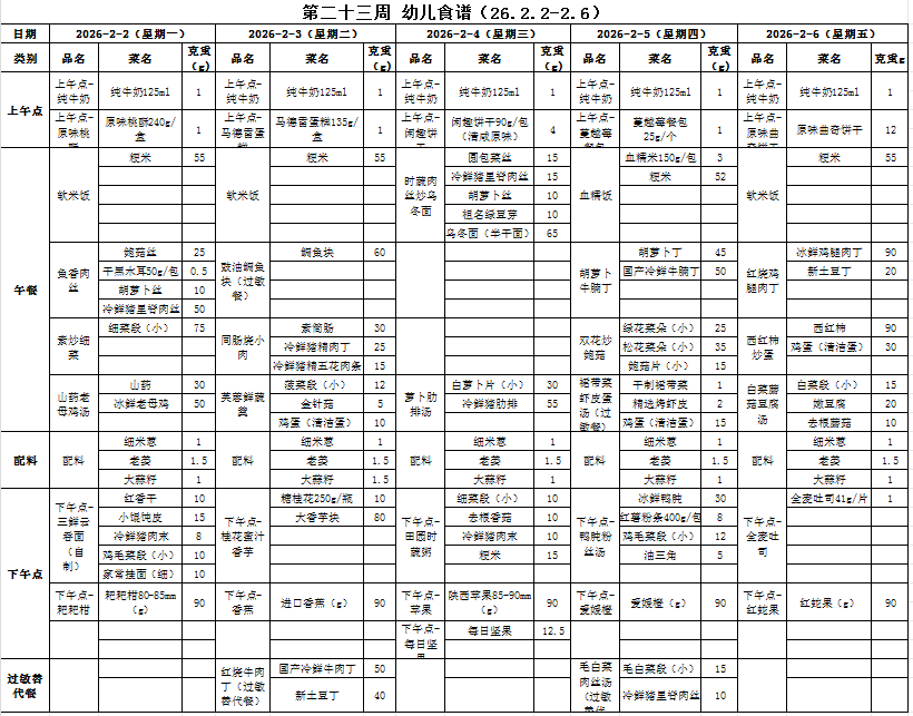 第二十三周 幼儿食谱(2026.2.2-2026.2.6)
