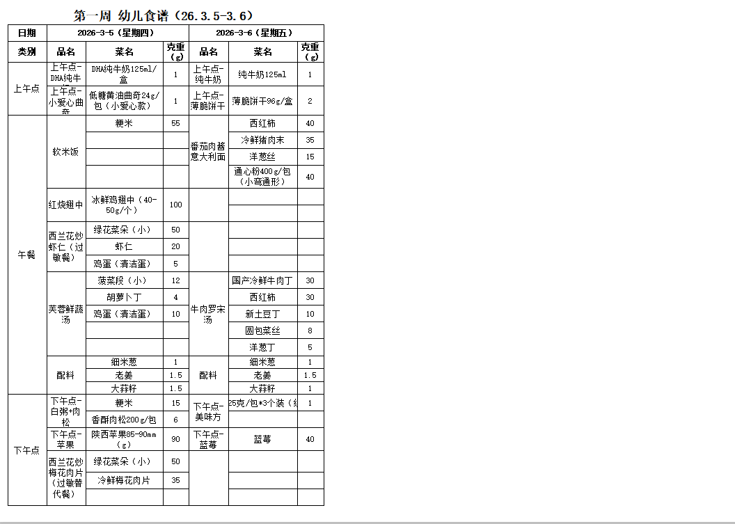 第一周 幼儿食谱 (2026.3.5-3.6)