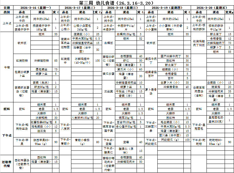 第三周 幼儿食谱 (2026.3.16-3.20)