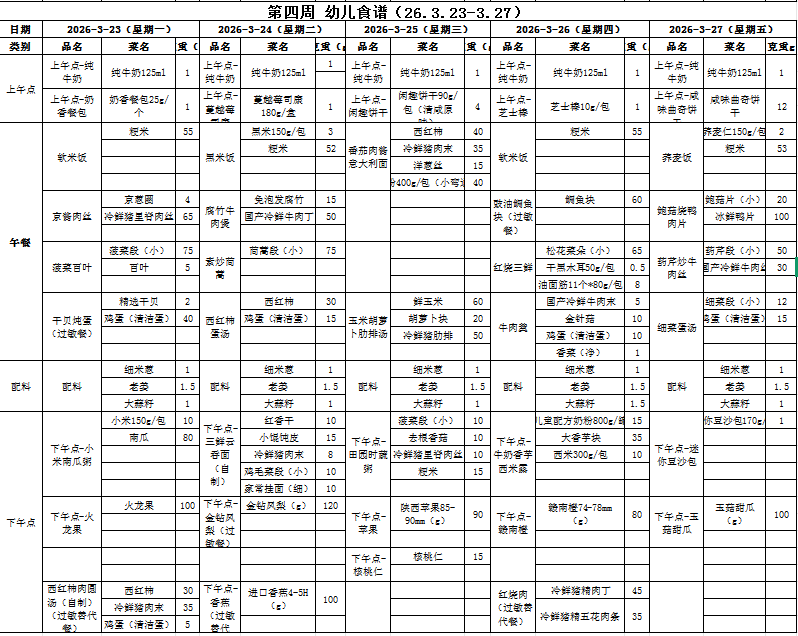 第四周 幼儿食谱 (2026.3.23-3.27)