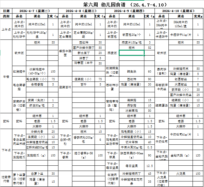 第六周 幼儿食谱 (2026.4.7-2026.4.10)