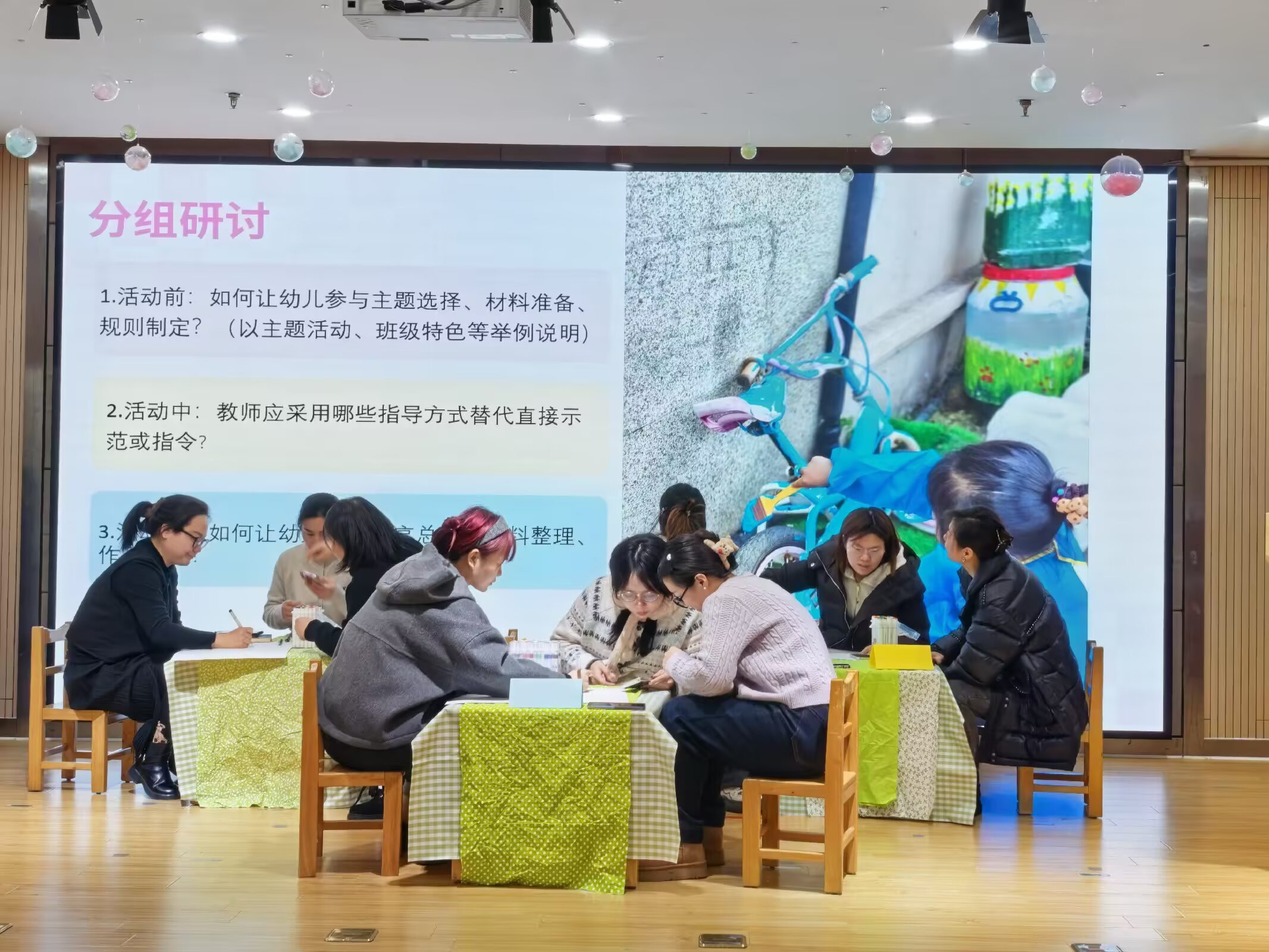 紧接着,教师们根据拿到的颜色卡片重新分三组,展开针对性研讨。第一组 围绕“如何让幼儿参与主题选择、材料准备、规则制定”,结合主题活动与班级特色碰撞出诸多创意想法;第二组深耕“教师应采用哪些指导方式替代直接示范或指令”,探索出启发式、提问式等多元指导路径;第三组则聚焦“如何让幼儿主导分享总结、材料整理、作品处理”,梳理出幼儿自主管理的有效策略。研讨过程中,教师们各抒己见、集思广益,认真完成研讨记录,在思维的碰撞中凝聚智慧。