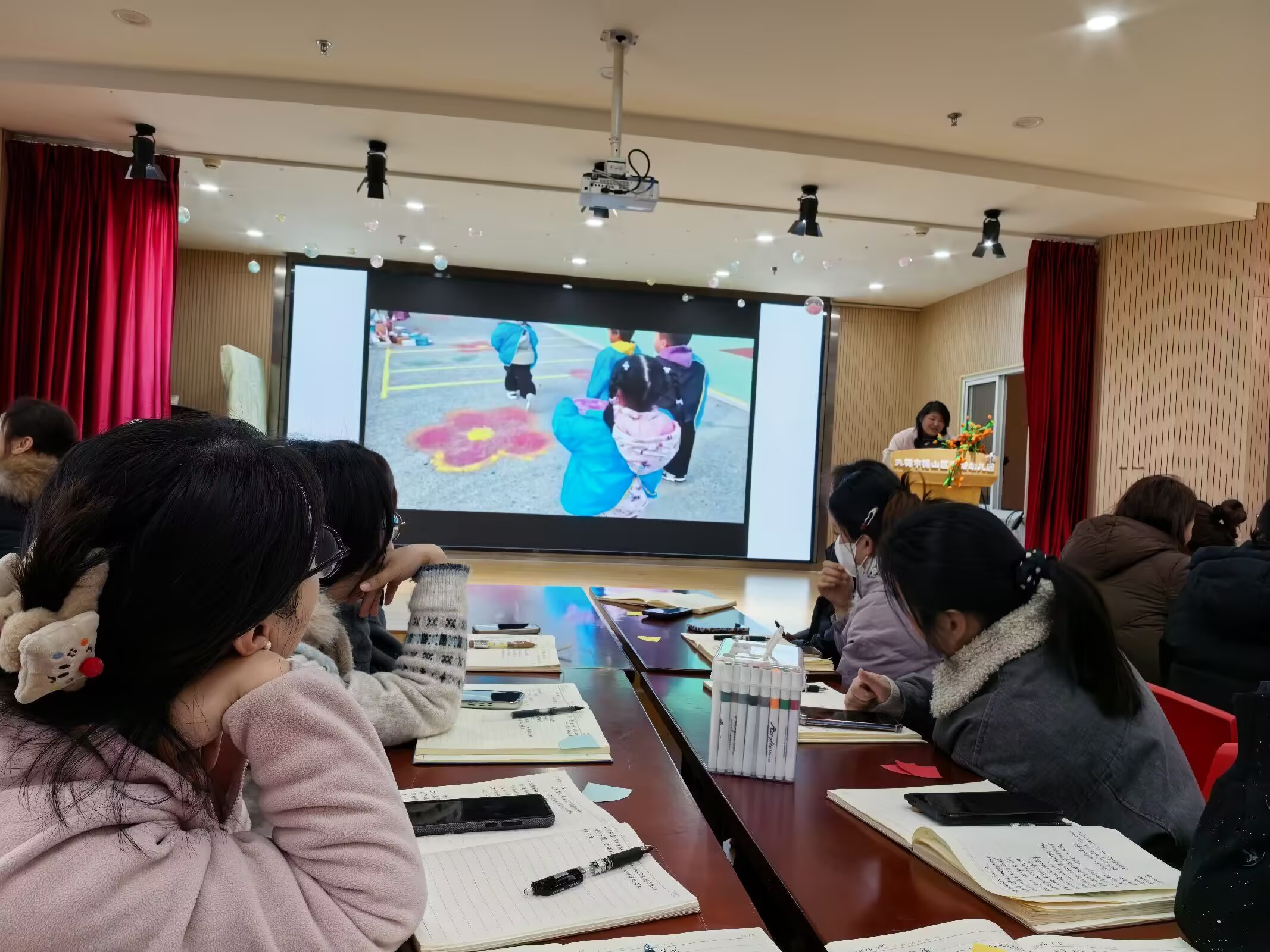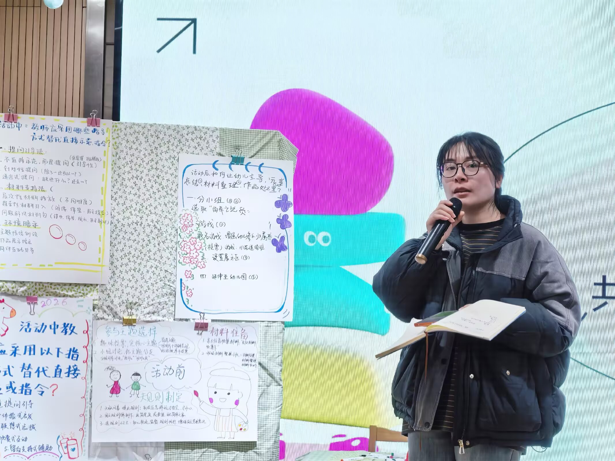 在案例分享环节,一位经验丰富的教师结合精心制作的视频与照片,分享了自己在户外彩绘区组织中的实践经验。她从活动流程的科学设计、层次性材料的投放思路、差异化幼儿引导方法等方面展开详细讲解,分享了具体的解决策略与实施效果。